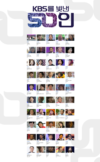 KBS32() 오전, KBS 공사창립 50주년을 맞아 개최한 공영방송 50주년 기념 리셉션에서 ‘KBS를 빛낸 50을 발표했다. ‘KBS를 빛낸 50197333일 한국방송공사 창립 이후 지난 50년간 KBS 프로그램을 통해 시청자에게 즐거움과 감동을 선사함으로써 KBS를 빛낸 인물로 시청자 투표를 통해 선정했다.